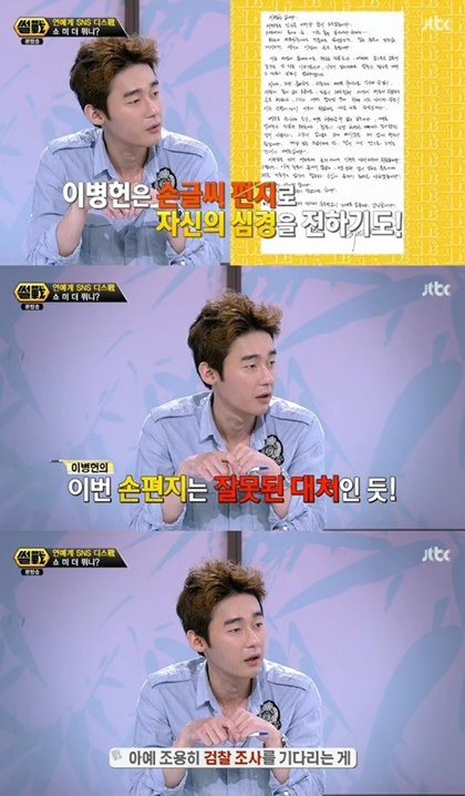 이날 허지웅은 이병헌의 손편지에 대해 "아예 조용히 있든가 정말 잘못된 대처였고 잘못된 위기 관리였다"며 "나는 차라리 이런 손편지를 공개하기 전에 조용히 검찰 조사를 기다리는 게 현명한 판단 아니었을까 생각한다"고 자신의 솔직한 생각을 전해 이목을 집중시켰다.