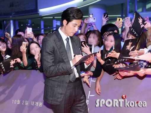배우 정우성이 26일 오후 서울 영등포구 영등포동 타임스퀘어에서 진행된 영화 `마담 뺑덕` 레드카펫 행사에 참석해 팬에게 사인을 해주고 있다.