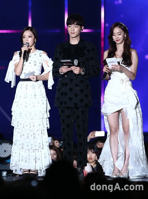 구하라(왼쪽부터), 서강준, 다솜이 28일 오후 경상북도 경주시 경주시민운동장에서 열린 ‘2014 경주 한류드림페스티벌’에서 진행을 하고 있다.