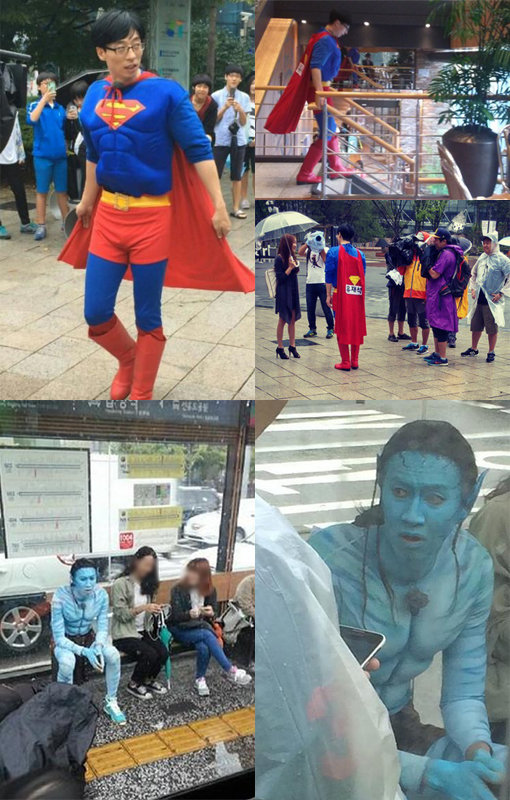 공개된 사진에는 슈퍼맨 분장을 한 유재석과 영화 ‘아바타’ 속 캐릭터를 분장한 이광수의 모습이 담겨 있다. 특히 이광수는 ‘아바타’ 캐릭터를 분장한 채 합정역 인근의 버스정류장에서 처량한 모습으로 시민들에게 포착돼 보는 이들의 웃음을 선사한다.