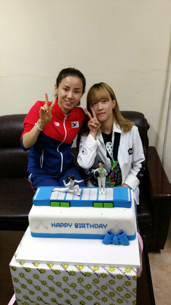 29일 생일을 맞은 ‘펜싱 여왕’ 남현희(성남시청·왼쪽)는 팬 김설화 씨로부터 특별한 생일 케이크를 받고 활짝 웃었다. 남현희와 김 씨가 케이크 앞에서 V자를 그리고 있다. 사진제공|남현희