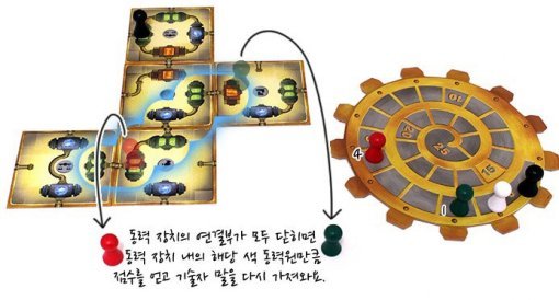 기술자 말을 놓았다면 점수를 확인한다. 타일을 연결했을 때, 동력 장치의 연결부가 모두 닫혀서 장치가 완성되면 점수를 계산할 수 있다. 완성된 동력 장치가 있다면 배치된 기술자를 회수하고, 완성된 장치에서 기술자를 놓은 동력원과 같은 색깔의 동력원 개수만큼 1점씩 획득한다. 회수한 기술자는 점수를 얻는 데 다시 사용할 수 있다. 플레이어들이 가진 기술자는 총 3명뿐이니, 심사 숙고해서 배치해야 한다.