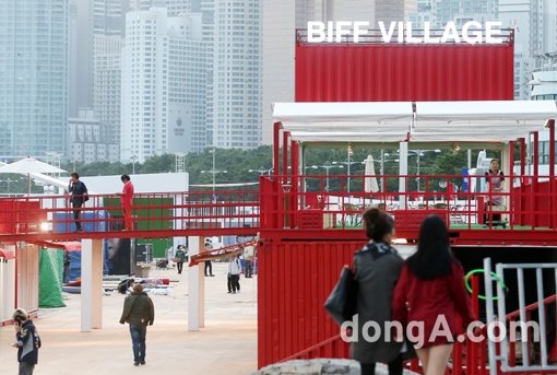 제19회 부산국제영화제(BIFF) 개막 하루를 앞둔 1일 오후 부산 해운대 비프빌리지에서 관계자들이 분주하게 마무리 작업을 하고 있다.