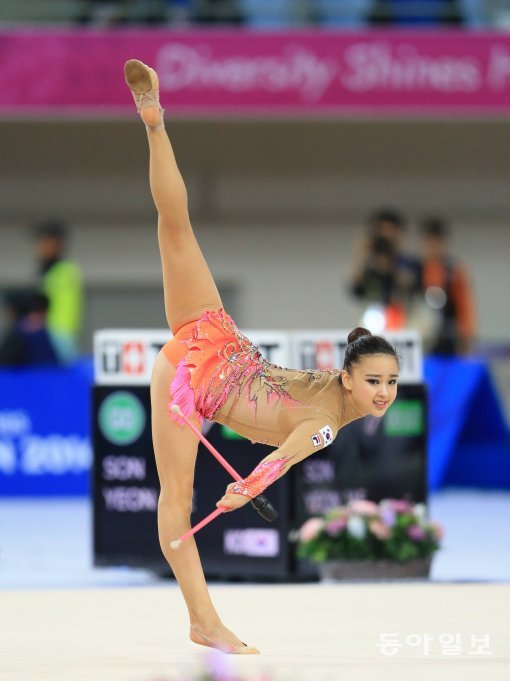 손연재는 2일 인천 남동체육관에서 열린 2014 인천아시안게임 리듬체조 개인종합 결선 곤봉 종목에서 18.100점을 받은 뒤 리본에서도 18.083점을 얻었다.