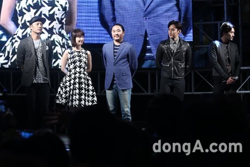 배우 진구, 이정현, 김한민 감독, 권율, 오타니 료헤이가 4일 오후 부산광역시 중구 남포동 비프광장에서 열린 영화 ‘명량’ 무대인사에 참석해 인사를 하고 있다.