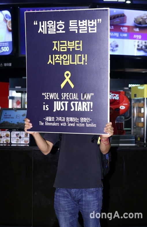 6일 오후 부산광역시 해운대구 센텀CGV에서 열린 영화 ‘다이빙벨’ 상영관 앞에서 시위를 하고 있다.