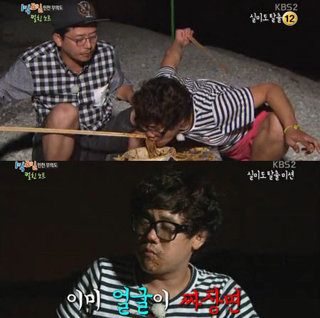 이날 방송에서 그는 긴 젓가락을 이용해 2분 안에 짜장면을 먹는 미션을 받았다. 이 미션을 성공하면 두 사람은 실미도에서 벗어날 수 있는 상황.