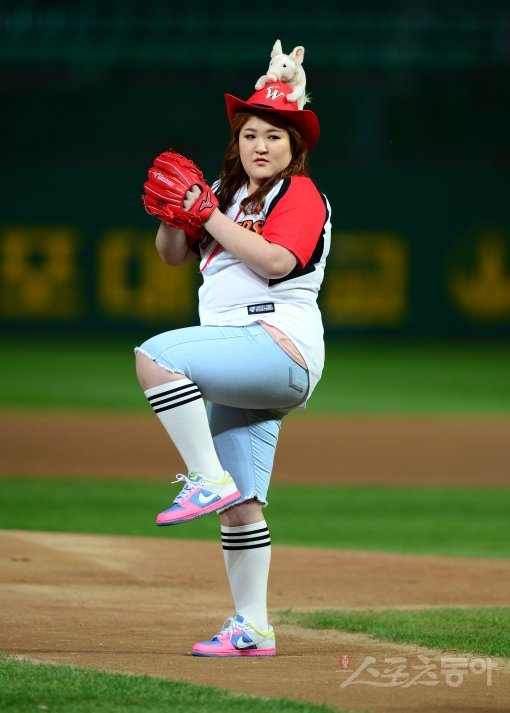6일 인천 문학야구장에서 ‘2014 한국야쿠르트 세븐 프로야구’ SK 와이번스와 한화 이글스의 경기가 열렸다. 경기에 앞서 개그우먼 이국주가 시구를 던지고 있다.