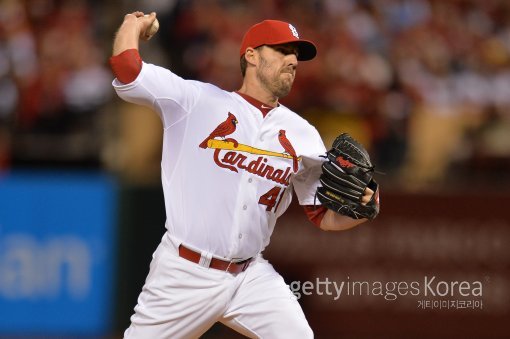 존 래키(세인트루이스)가 7일(한국시간) 미국 미주리 주 세인트루이스의 부시 스타디움에서 열린 LA 다저스와의 메이저리그 내셔널리그 디비전시리즈(NLDS) 3차전에 선발 등판, 투구하고 있다.