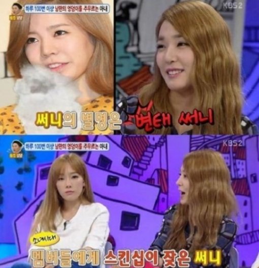 태연 역시 “써니가 주로 팔꿈치나 어깨, 엉덩이를 만진다”고 거들어 웃음을 자아냈다.