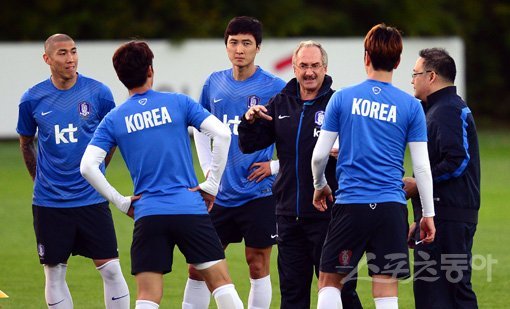 축구대표팀 신임 사령탑 울리 슈틸리케(60·독일) 감독은 7일 경기도 파주 국가대표트레이닝센터(NFC)에서 취임 후 첫 훈련을 지휘했다. 이날 훈련에는 23명의 선수 중 2014인천아시안게임 결승 북한전에서 오른쪽 발목 타박상을 입은 장현수(23·광저우 부리)를 제외한 22명의 선수가 참여했다.