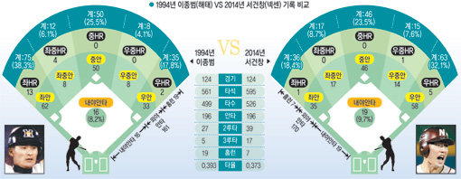 안타 분포를 보면 둘 다 스프레이 히터로서, 어떤 코스로든 안타를 날릴 수 있는 능력을 발휘하고 있다. 우타자인 이종범은 내야안타 16개(8.2%)를 기록하면서 왼쪽(좌측 75개, 좌중간 12개)으로 약 44.4%를 때렸고, 가운데(50개)로 25.5%, 오른쪽(우측 35개, 우중간 8개)으로 21.9%를 날렸다. 우투좌타인 서건창은 오른쪽(우측 63개, 우중간 15개)으로 39.7%, 가운데(46개)로 23.5%, 왼쪽(좌측 35개, 좌중간 17개)으로 27.1%를 기록했다. 내야안타는 19개(9.7%)로 이종범보다 3개 많았다. 흥미로운 기록 하나. 이종범은 1994년 병살타가 2개뿐이었다. 서건창은 올해 병살타가 1개뿐이다.