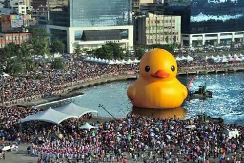 러버덕 프로젝트는 어린 시절 가지고 놀았던 추억의 노랑 오리를 대형 고무 오리로 제작해 물 위에 띄우는 방식이다.