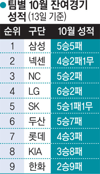 반면 SK는 5승1패1무를 기록해 8할 승률을 올렸다. NC도 5승2패의 좋은 성적을 남겼다. 두 팀 모두 선발이 5이닝 이상을 막아줬고, ‘필승조’를 조기 가동하면서 승부수를 던졌다. LG는 8경기 6승2패. 선발 신정락의 가세와 ‘필승조’ 이동현, 봉중근의 활약 그리고 타선의 강한 응집력이 돋보인다. 세 팀은 각각 방어율 3.60-2.03-3.88의 좋은 성적을 기록했다. 경기가 적게 남았기 때문에 불펜도 매 경기 총력전을 펼칠 수 있었다.