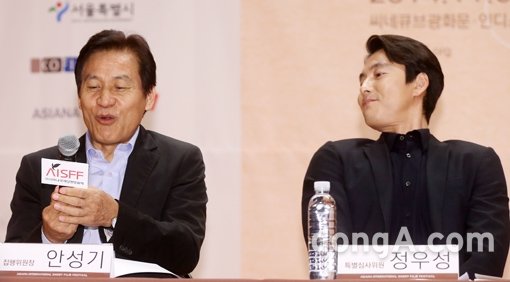 배우 안성기(왼쪽)와 정우성이 14일 오전 서울 종로구 금호아트홀에서 열린 제12회 아시아나 국제단편영화제 상영작 발표 기자회견에서 인사말을 하고 있다.