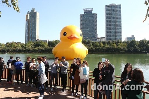 서울 송파구 석촌호수에 14일 대형 고무 오리 '러버덕(Rubber Duck)'이 등장했다.