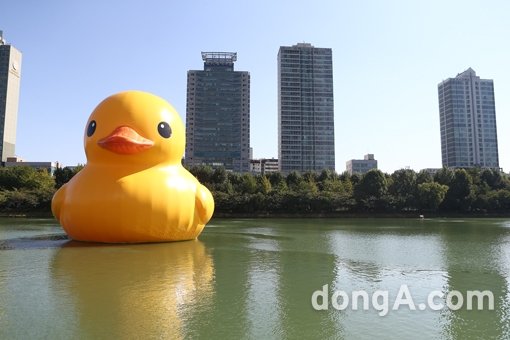 러버덕이 14일 오후 서울시 송파구 석촌호수에 공개됐다.