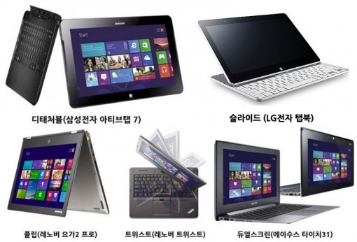 가장 대표적인 사례는 PC쪽에서 쉽게 찾아볼 수 있다. 일반 노트북과 태블릿PC의 형태를 오가며 쓸 수 있는 투인원(2 IN 1) 형식의 제품을 삼성전자, LG전자, 에이수스, 레노버 등 거의 대부분 제조사에서 내놓고 판매 중이다. 삼성전자의 ‘아티브탭7’과 같이 화면과 키보드가 분리되는 형태, LG전자의 ‘탭북’과 같이 키보드를 덮은 화면을 밀어 올려 모습을 전환하는 형태 등 구성도 다양하다.