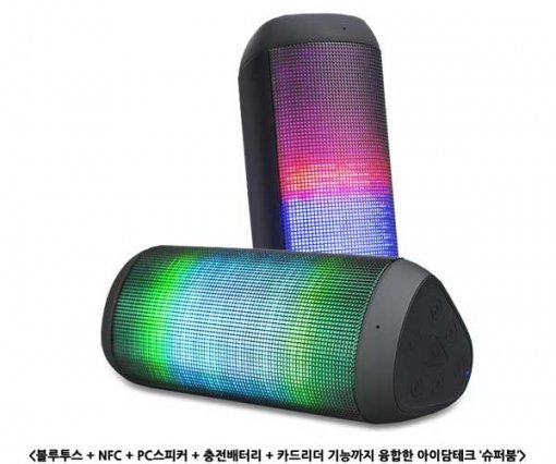 아이담테크의 ‘슈퍼붐(Super-Boom)’은 일단 블루투스 방식의수선 스피커로 분류되지만, 그 외에도 스마트폰을 스피커 본체에 접촉하면 간단히 등록 연결이 되는 NFC 기능, 메모리카드를 꽂아 구현하는 MP3 플레이어 기능, 모바일 기기를 충전하는 배터리 기능도 갖췄다. 그 외에 PC와 USB로 연결하면 충전과 동시에 PC용 USB 스피커 및 메모리카드 리더로도 쓸 수 있으며, 스피커 앞쪽 전체에 춤추듯 점등하는 LED를 넣어 시각적 효과도 극대화했다.