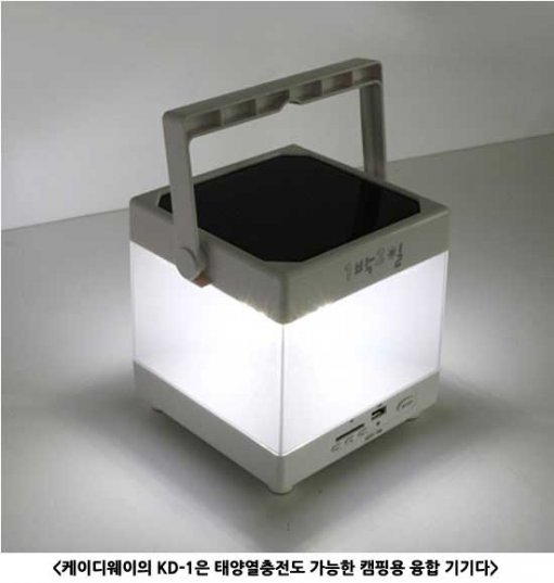 케이디웨이의 ‘1박2일 KD-1’은 캠핑에 특화된 종합 선물세트를 지향하는 제품이다. FM 라디오 겸 MP3 플레이어, 모바일 기기 연결(유선)용 스피커, 그리고 외부기기를 충전하는 배터리 및 캠핑장에서 요긴한 LED 랜턴으로도 쓸 수 있다. 기기 충전은 외부전원 연결 외에 태양열로도 할 수 있어 아웃도어용으로 요긴하다.