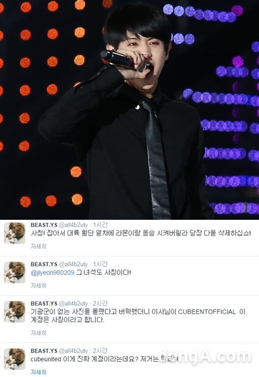 양요섭은 14일 오후 자신의 트위터 계정을 통해 “cubeunited, 이게 진짜 계정이라는데요? 저거는 뭐죠?”라며 “기광 군이 없는 사진을 올렸다고 버럭했더니 이사님이 ‘CUBEENTOFFICIAL’이 계정은 사칭이라고 합니다”라고 글을 남겼다.