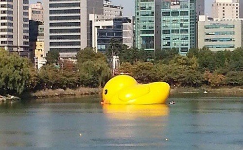 지난 5일 ‘러버덕 프로젝트’의 공식 트위터에 따르면 600kg짜리 ‘러버덕’이 14일부터 11월 14일까지 한 달 간 서울 석촌호수에서 전시 중이다.