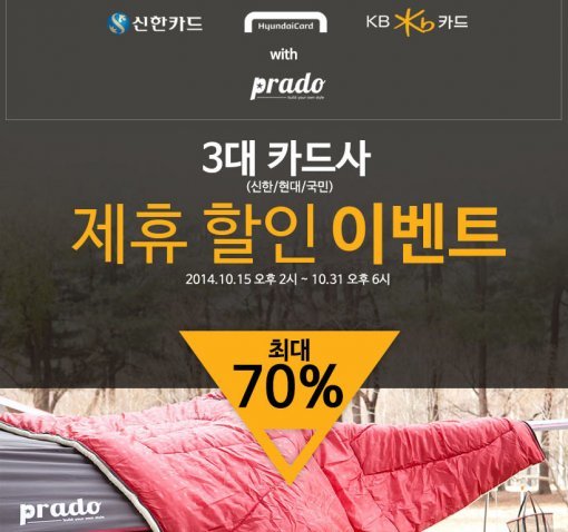 이 기간에 신한카드, 국민카드, 현대카드 사용 고객은 프라도 공식 온라인 스토어를 통해 전품목에 대해 최대 70% 할인된 금액으로 캠핑용품을 구매할 수 있다. 다만, 해당 카드사 최근 3개월간 이용실적이 있어야 하며 제품 5만원 이상 구매시 할인 적용 받을 수 있다.