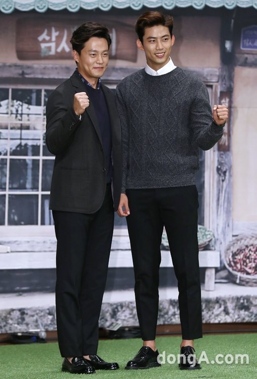 배우 이서진(왼쪽), 2PM의 멤버 옥택연이 15일 오후 서울시 영등포구 63컨벤션에서 열린 tvN ‘삼시세끼’ 제작발표회에서 포토타임을 하고 있다.