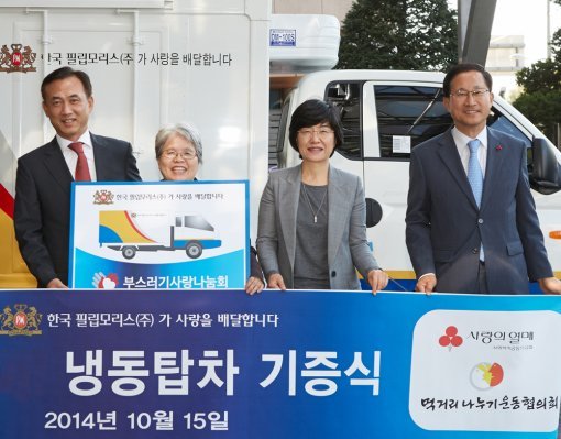 한국필립모리스㈜(대표이사 정일우)가 10월15일 서울 용산구에 위치한 사회복지단체 부스러기사랑나눔회(이사장 강명순)에 41번째 ‘먹거리 나누기 냉동탑차’를 기증했다.