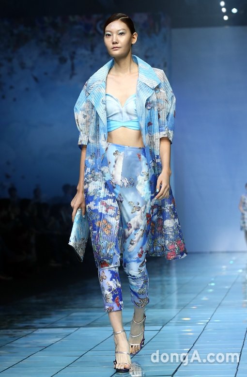 모델이 19일 오후 서울시 중구 동대문디자인플라자에서 열린 ‘2015 S/S 서울패션위크’ 이상봉 디자이너 ‘LIE SANGBONG’ 콜렉션에서 런웨이를 걷고 있다.