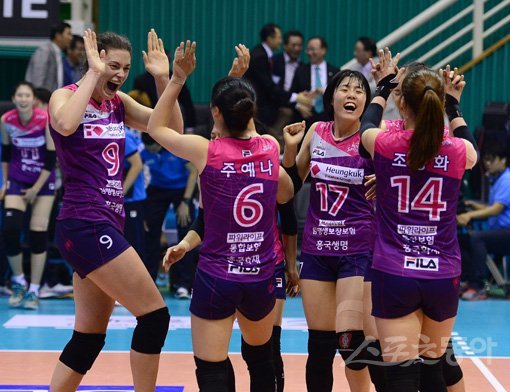 흥국생명 선수들이 19일 평택 이충문화체육관에서 열린 2014∼2015 V리그 여자부 GS칼텍스와의 경기에서 풀세트 접전 끝에 3-2로 승리한 뒤 환호하고 있다. 평택|김종원 기자 won@donga.com 트위터 @beanjjun