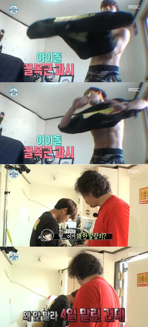 그러자 김동준은 육중완에게 갈아 입을 옷을 건네 받았고, 방 한쪽에서 상의를 탈의하며 탄탄한 복근을 드러냈다. ‘체육돌‘이라는 별칭한 보유한 그답게 군살없는 복근이 시선을 모았다.