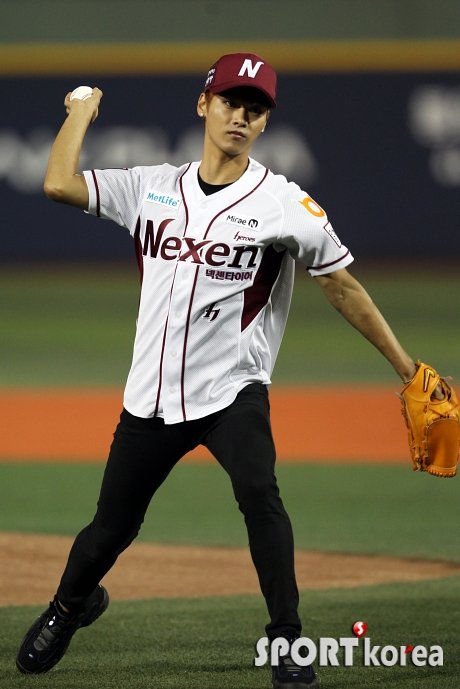 27일 오후 서울 목동구장에서 열린 2014 프로야구 넥센 히어로즈와 LG 트윈스의 플레이오프 1차전에서 아이돌그룹 빅스(VIXX)의 엔이 시구하고 있다.