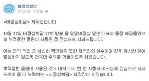 제작진은 “10월 27일 비정상회담 17회 방송 중 일일비정상 일본 대표의 등장 배경음악으로 부적절한 음원이 사용된 점 진심으로 사과드린다”고 밝혔다.