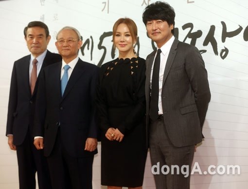 28일 오후 서울 중구 소공동 롯데호텔에서 제51회 대종상영화제 기자간담회에서 참석자들이 포토타임을 하고 있다. 이규태 조직위원장, 남궁원 한국영화인총연합회 회장, 배우 송강호,엄정화(왼쪽부터)