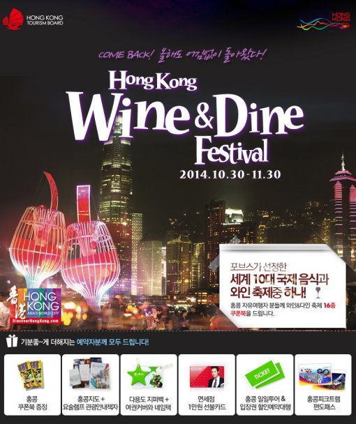 온라인 전문 여행사 웹투어는 ‘와인 앤 다인 페스티벌’ 특전을 제공하는 11월 홍콩 실속여행 기획전을 내놓았다. 와인 앤 다인 페스티벌 16종 쿠폰 북과 요술램프 관광안내 책자, 면세점 1만원 선불카드, 홍콩 피크트램 편도 패스 등을 무료로 주다. 웹투어는 이밖에도 축제 기간에 홍콩의 매력을 느낄 수 있는 실속여행 상품을 준비하고 있다.