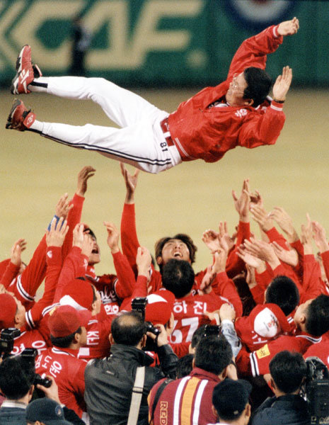 한화의 유일한 한국시리즈 우승은 1999년 이뤄졌다. 롯데를 꺾고 우승을 확정한 직후 한화선수들이 이희수 감독을 헹가래쳐주고 있다. 스포츠동아DB