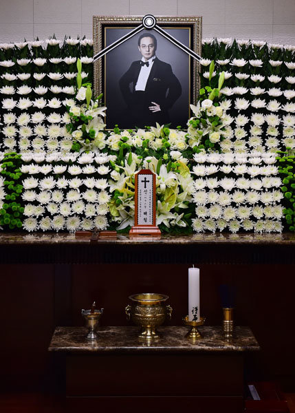 27일 세상을 떠난 가수 신해철의 빈소가 마련된 서울 풍납동 아산병원 장례식장에 28일 고인의 영정이 놓였다. 단정하게 차려입은 턱시도에, 날카로운 눈매까지 사진 속 모습은 생전 그대로다. 하지만 더 이상 ‘마왕’의 목소리는 들을 수 없게 됐다. 사진제공|사진공동취재단
