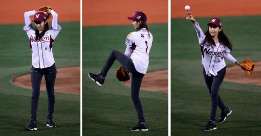 28일 서울 목동야구장에서 열린 2014 한국야쿠르트 세븐 프로야구 플레이오프 2차전 넥센히어로즈 대 LG트윈스 경기 전 걸그룹 애프터스쿨 의 유이가 시구를 하고 있다. 목동 | 김종원기자 won@donga.com 트위터@beanjjun