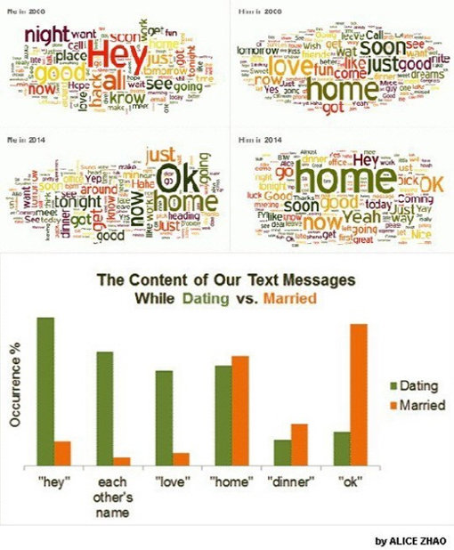 최근 미국 자료 분석 과학자(데이터 과학자) 엘리스 자오는 특별한 연구 결과를 내놨다. 남편과 자신이 주고받은 문자 메시지를 분석하여 결혼을 전후해 문자 메시지 내용이 변했는지를 정리한 것.