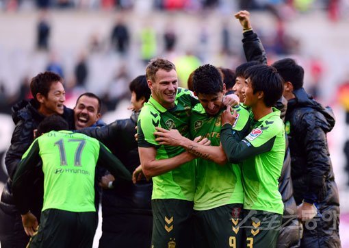 전북현대가 2일 서울월드컵경기장에서 펼쳐진 ‘현대오일뱅크 K리그 클래식 2014’ 34라운드 원정경기에서 후반 48분 터진 브라질 공격수 카이오의 결승골로 FC서울을 1-0으로 눌렀다. 21승8무5패, 승점 71의 전북은 전날 울산 원정에서 3-0 완승을 거둔 2위 수원삼성(17승10무7패·승점 61)과의 격차를 그대로 유지했다. 8일 35라운드 제주 원정에서 승리할 경우 남은 일정에 상관없이 2009년과 2011년에 이어 통산 3번째로 K리그 정상을 밟을 수 있다.