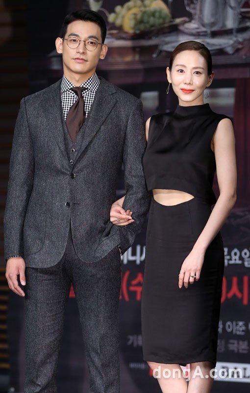 배우 정석원(왼쪽)과 박예진이 3일 오후 서울 마포구 MBC 상암 사옥에서 열린 새 수목드라마 '미스터 백' 제작발표회에서 포토타임을 하고 있다.