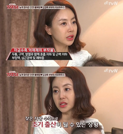 황혜영은 4일 방송된 tvN ‘현장토크쇼 택시’에서 “41세에 임신하니 6개월부터 만삭 배라 거동도 불편했다”고 말했다.