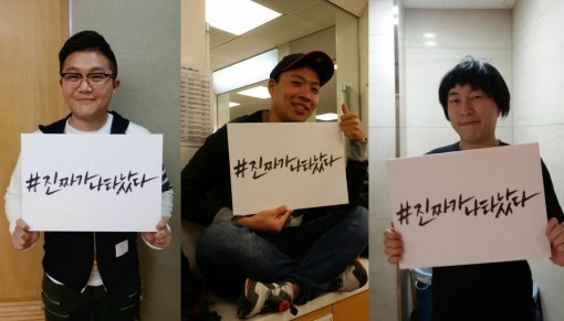 앞서 지난 3일 JTBC ‘비정상회담’ 등에 출연중인 가나 출신 유학생 방송인 샘오취리가, 4일에는 빅스(VIXX)와 제국의 아이들 멤버 광희가 ‘진짜가 나타났다’ 피켓을 들고 있는 사진이 공개된 바 있다.