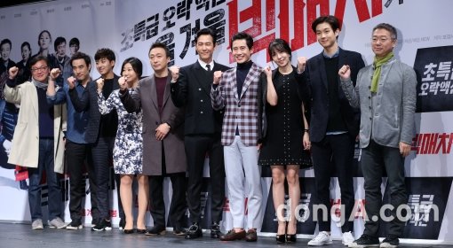6일 오전 서울 강남구 압구정 CGV에서 열린 영화 '빅매치' 제작보고회에서 참석자들이 파이팅 포즈를 취하고 있다.