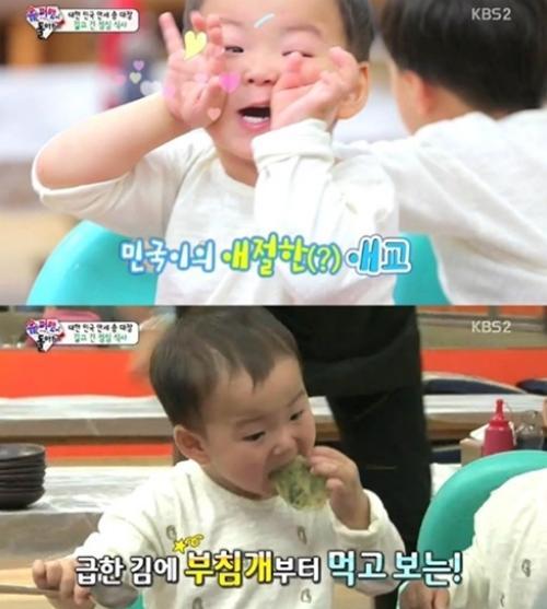 이날 방송에서 삼둥이는 식당에서 "배고파"를 연발하며 식사가 나오기를 재촉했으며 민국이는 "이모님~ 맘마 주세요~이모님~"이라고 외치며 특유의 애교를 발산했다.