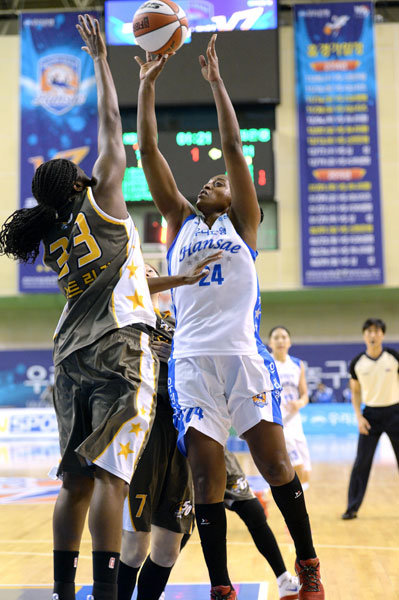 우리은행은 10일 춘천 호반체육관에서 펼쳐진 ‘KB국민은행 2014∼2015 여자프로농구’ KB스타즈와의 홈경기에서 양 팀 통틀어 최다인 21점을 올린 외국인선수 샤데 휴스턴의 활약을 앞세워 62-49의 완승을 거뒀다. 나란히 2승무패를 기록 중이던 KB스타즈까지 따돌린 우리은행은 개막 3연승으로 단독 1위에 올랐다. 우리은행은 삼성과 신한은행을 제친 데 이어 KB스타즈까지 잡아 올 시즌에도 별다른 대항마가 없는 ‘1강’임을 입증하며 시즌 초반부터 통합 3연패를 향해 순항했다. KB스타즈는 신한은행에 공동 2위를 허용했다.