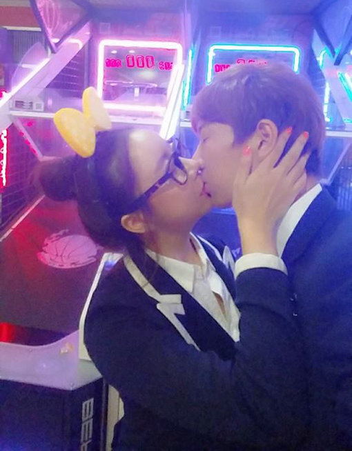 사진에는 하나경이 남자친구와 교복 차림으로 키스하는 모습이 담겨 있다. 두 사람은 오락실을 배경으로 진하게 입을 맞추고 있다.