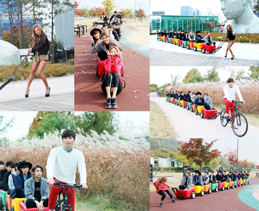 효린, 케이윌, 소유는 수레를 끌어보려고 안간힘을 쓰지만 뜻대로 되지 않자 연습생들을 향해 단호한 눈빛을 보내고 있어 웃음을 자아내고 있다. 각각 ‘효수레’, ‘케수레’, ‘소수레’라는 애칭까지 붙인 수레에 올라단 12명의 연습생들은 수려한 외모와 귀여운 포즈, 특유의 재치있는 끼를 드러내고 있다.