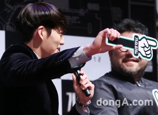배우 김우빈이 18일 오전 서울 광진구 건대입구 롯데시네마에서 열린 영화 '기술자들' 제작보고회에서 셀카 잘 찍은 빕법을 공개하고 있다.